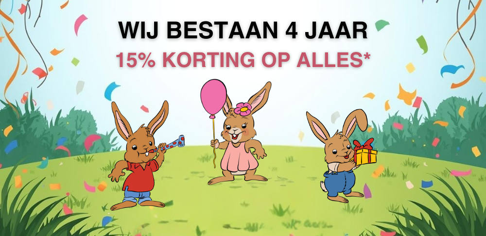 Besteed je op onze verjaardag voor meer dan € 100 bij ons, gaan wij eerst een vreugde-dansje doen en daarna geven we je 50 bonus punten op ons spaarprogramma. Daarnaast verloten wij onder al de bestellingen boven de € 100 in totaal 4 cadeaubonnen t.w.v. € 44. Deze cadeaubon kan dan gebruikt worden bij een volgende bestelling.